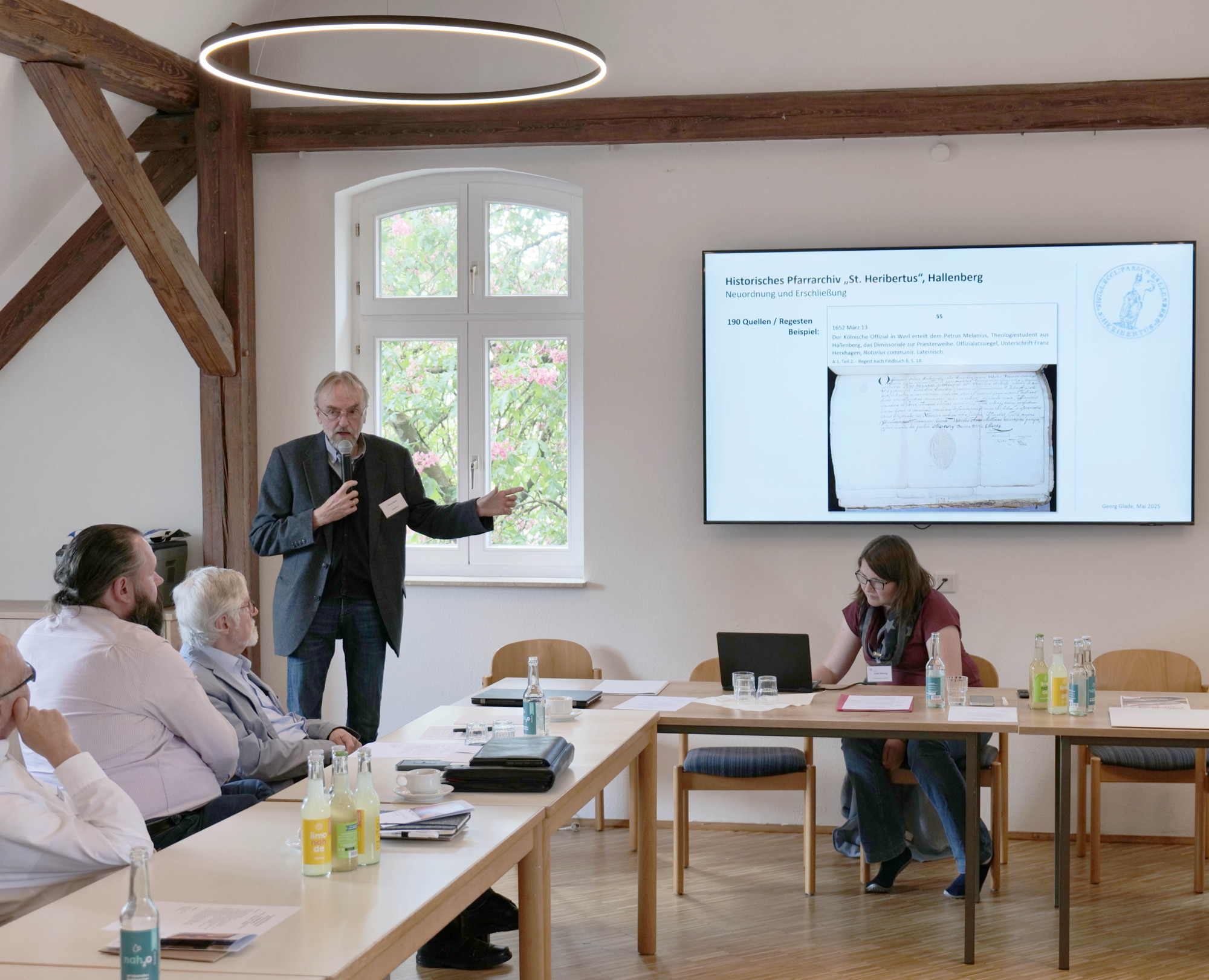 Hauptreferent des Archivtages war Georg Glade, ehrenamtlicher Pfarrarchivpfleger von Hallenberg. Seit Jahrzehnten ist er aus persönlichem historischem Interesse für das Pfarrarchiv und auch für das Stadtarchiv in seiner Heimatstadt Hallenberg tätig. Seine jahrelange Arbeit hat er jüngst in einer umfangreichen Publikation der interessierten Öffentlichkeit und der Wissenschaft zur Verfügung gestellt: Hallenberger Quellen und Archivverzeichnisse, Band 2: Stadtarchiv 1899-1950, Pfarrarchiv 1247-1976, Judaica 1291 [nach]-1802. (619 Seiten). In Niedermarsberg sprach er zum Thema „Historisches Pfarrarchiv „St. Heribertus“, Hallenberg – Neuordnung und Erschließung (2016-2024).“ Georg Glade machte beispielsweise auf die bemerkenswerten Schwierigkeiten bei der Besetzung der Pfarrstelle Hallenberg im 16. Jahrhundert aufmerksam, die sich damals wegen des örtlichen Dialekts mit hessischem Einschlag ergeben haben.