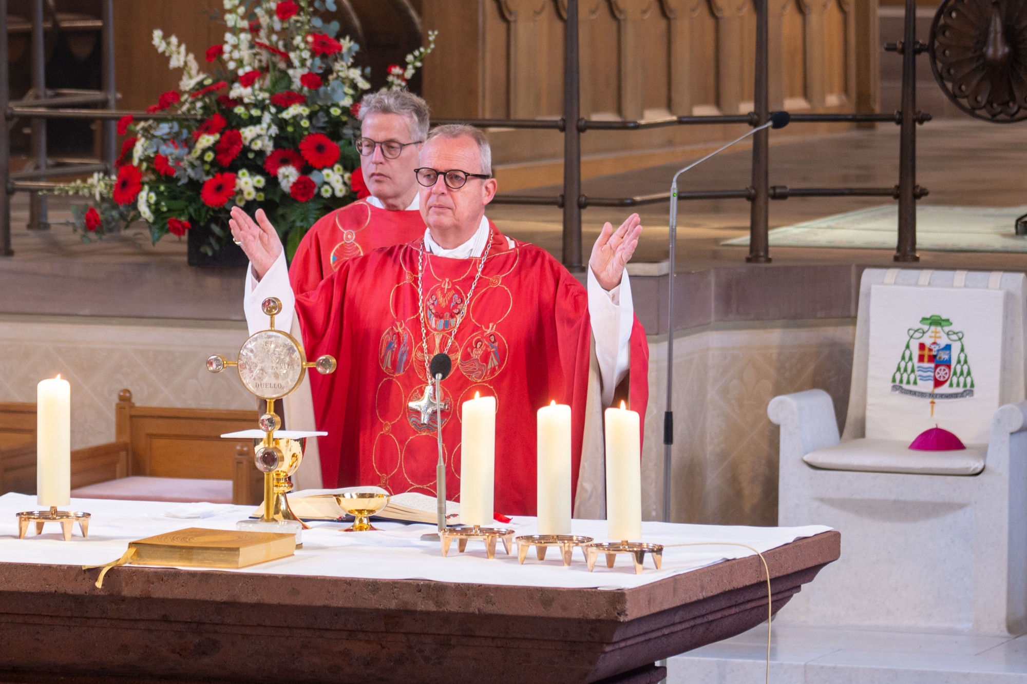 „Der Geist Gottes hält uns lebendig“, rief Weihbischof Josef Holtkotte den Gläubigen zu. Gottes pfingstlicher Geist sei kraftvoll, er trage das Leben der Menschen, sei die nie versiegende Quelle des persönlichen Glaubens, die Quelle für Zuversicht, Hoffnung, Zukunft und Leben, bezeugte Weihbischof Josef Holtkotte zum Abschluss seiner Predigt. „Diesem Geist dürfen wir uns mit großem Vertrauen öffnen. Er schenkt mir selbst, den Menschen, der Welt und der Kirche all das, was uns stark macht und verwandeln kann, damit ‚Gott alles in Allem‘ ist.“