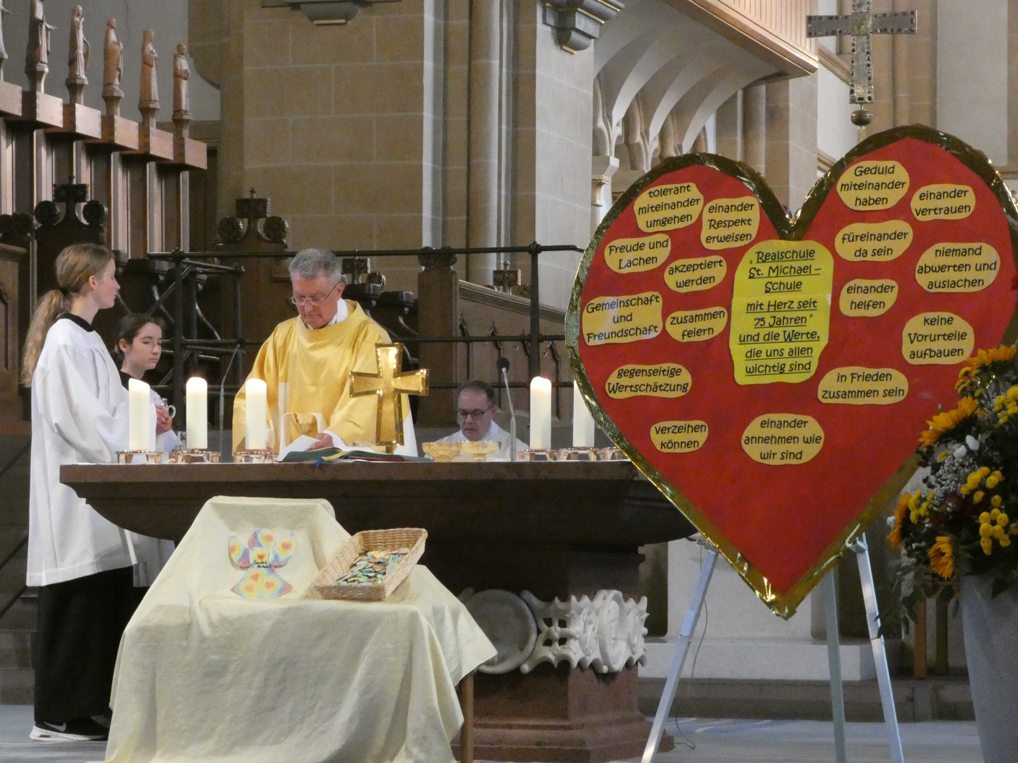 Die Realschule St. Michael blickt in diesem Jahr auf eine 75-jährige Erfolgsgeschichte zurück. Aus diesem Anlass fanden am vergangenen Montag und Dienstag auf Wunsch der Schülervertretung zwei Projekttage statt, die ganz im Zeichen von Kreativität, Teamgeist und dem Jubiläumsmotto: „Realschule St. Michael – Schule mit Herz seit 75 Jahren“ standen. In zahlreichen Projekten arbeiteten die Schülerinnen und Schüler an kreativen Aufgaben wie dem Basteln des Schmucks für den Festabend, an handwerklichen Aufgaben wie dem Bau von Strandstühlen für die Cocktail-Lounge des Schulfestes oder historischen Ausstellungen wie der Bild- und Ton-Dokumentation der Geschichte der Realschule St. Michael.