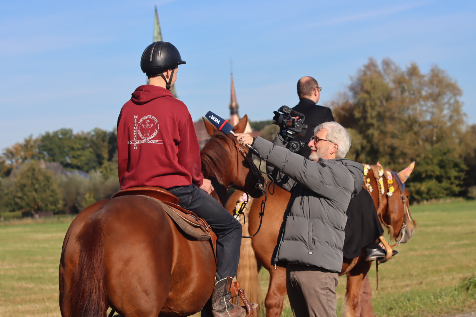 So etwas hatte es in dieser Form noch nie gegeben. Die Idee zur ersten Erntedank-Reiterprozession entstand nach einem Gottesdienst. Vikar Stiehler, der über Messdienerleiter Max Arp an die Five-Star-Ranch vermittelt wurde, erzählte von seinem neuen Hobby. Ein Wort gab das andere, und die Idee der Reiterprozession war geboren. Mit viel Begeisterung, Engagement und vor allem Freude begann das Team, das durch den Gemeindeausschuss der Pfarrei Heilige Familie ergänzt wurde, mit den Vorbereitungen. Vieles wurde bedacht, damit die Premiere gut gelingen würde. Der Erntedanktag kam und schenkte bei wundervollem, wenn auch herbstlich kühlerem Wetter gute Rahmenbedingungen für das Erntedankfest.
