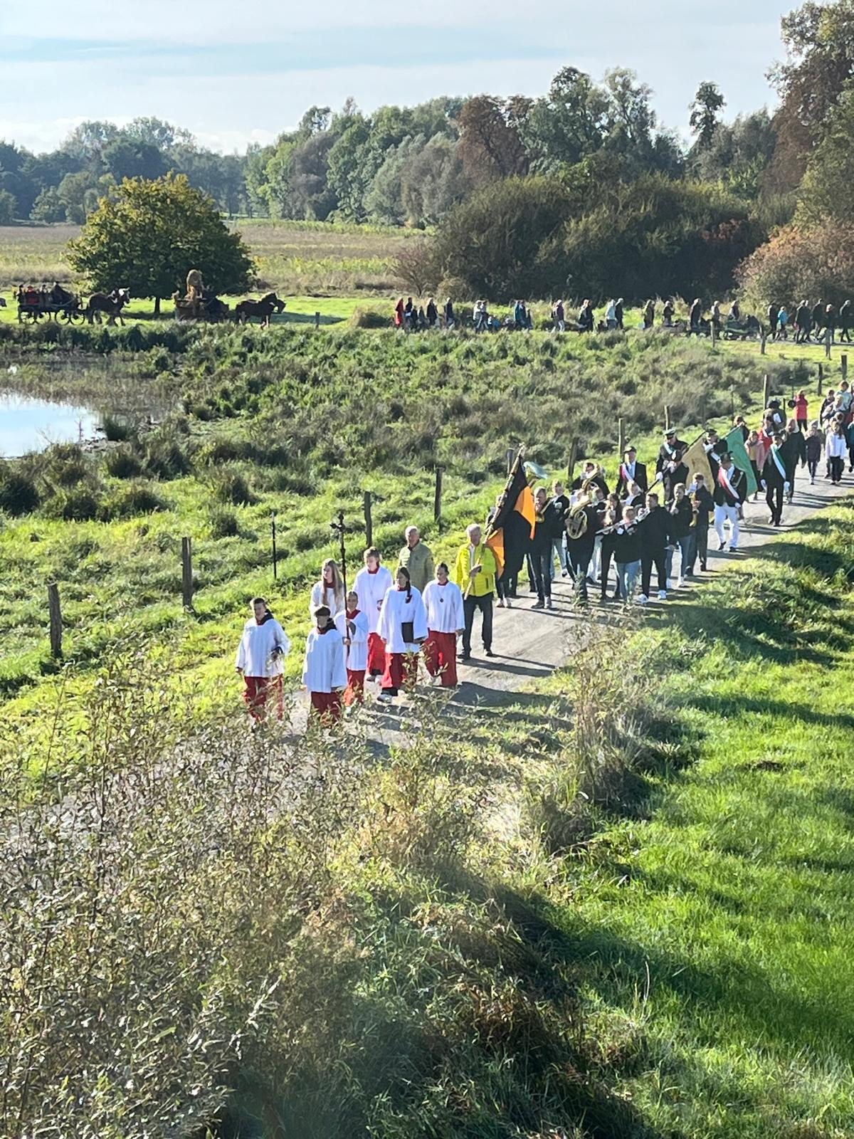 Nach dem Impuls an der St. Antonius-Kapelle, einem durch weitere Beiträge gestalteten Weg durch die Feldlandschaften und dem Naturschutzgebiet Woeste, das Dorf Ostinghausen und einem kurzen Abschnitt durch den naheliegenden Wald bog die Prozession unter Blasmusik und Gesang auf das Gelände von Haus Düsse ein. Hier wurde nach der Segnung von Erntekrone, Pferden und Reitern ein Freiluftgottesdienst gefeiert, der das Erntedankfest, die Schöpfung und die Verantwortung des Menschen für diese in den Blick nahm. Die Musikerinnen und Musiker sorgten bei und nach dem Gottesdienst für eine gelungene musikalische Untermalung.