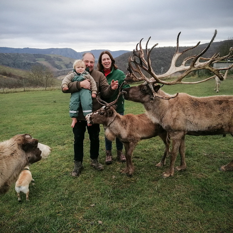 Sonja und Stefan können kaum fassen, dass das hier alles wirklich wahr ist: 20 Rentiere grasen auf ihrem rund 30.000 Quadratmeter großen Gelände zwischen den Weinbergen an der Nahe, zwischen ihnen stiefelt Töchterchen Antonia herum. Wie es einmal so weit kam, ist eine ziemlich verrückte Geschichte.