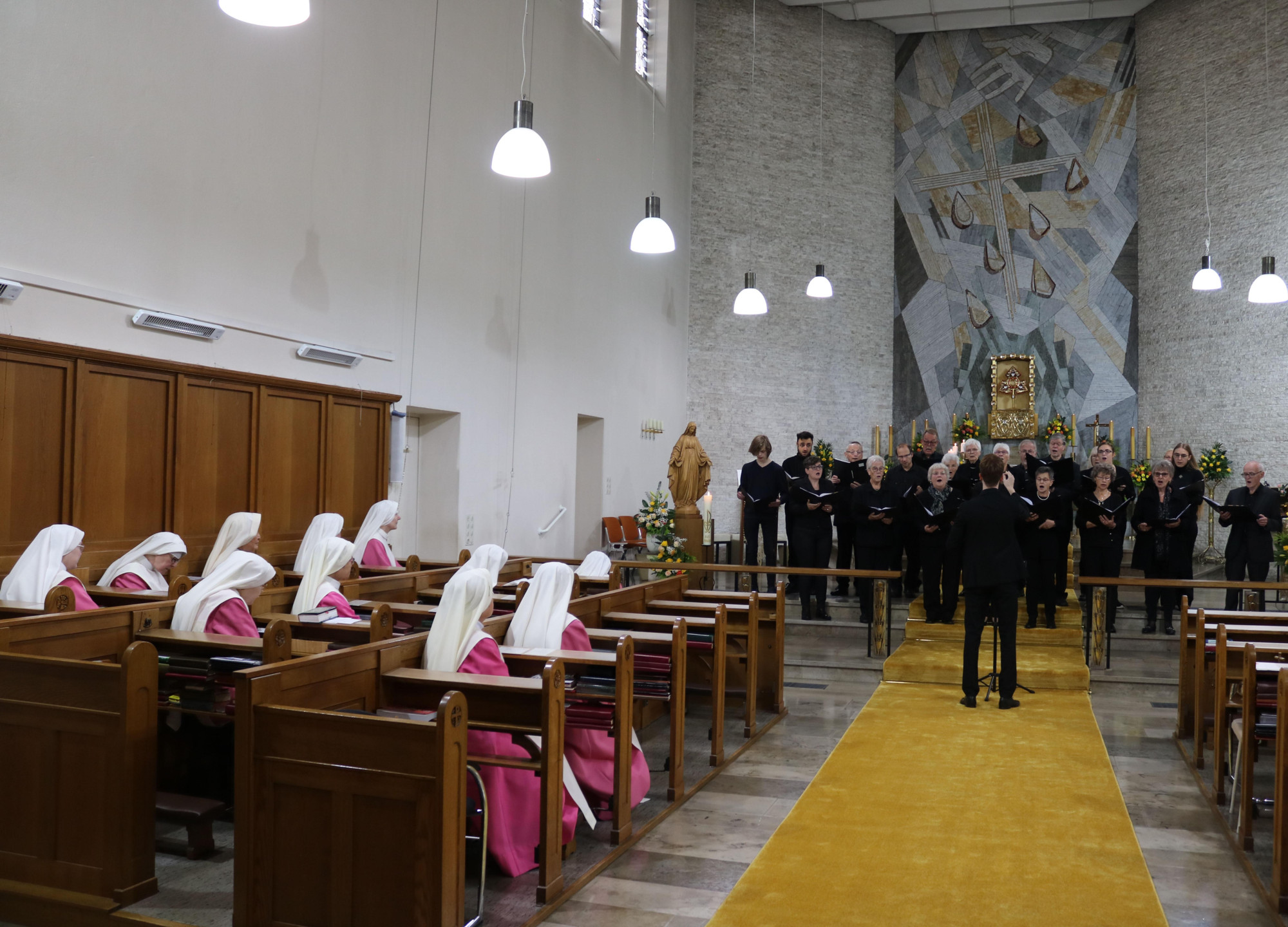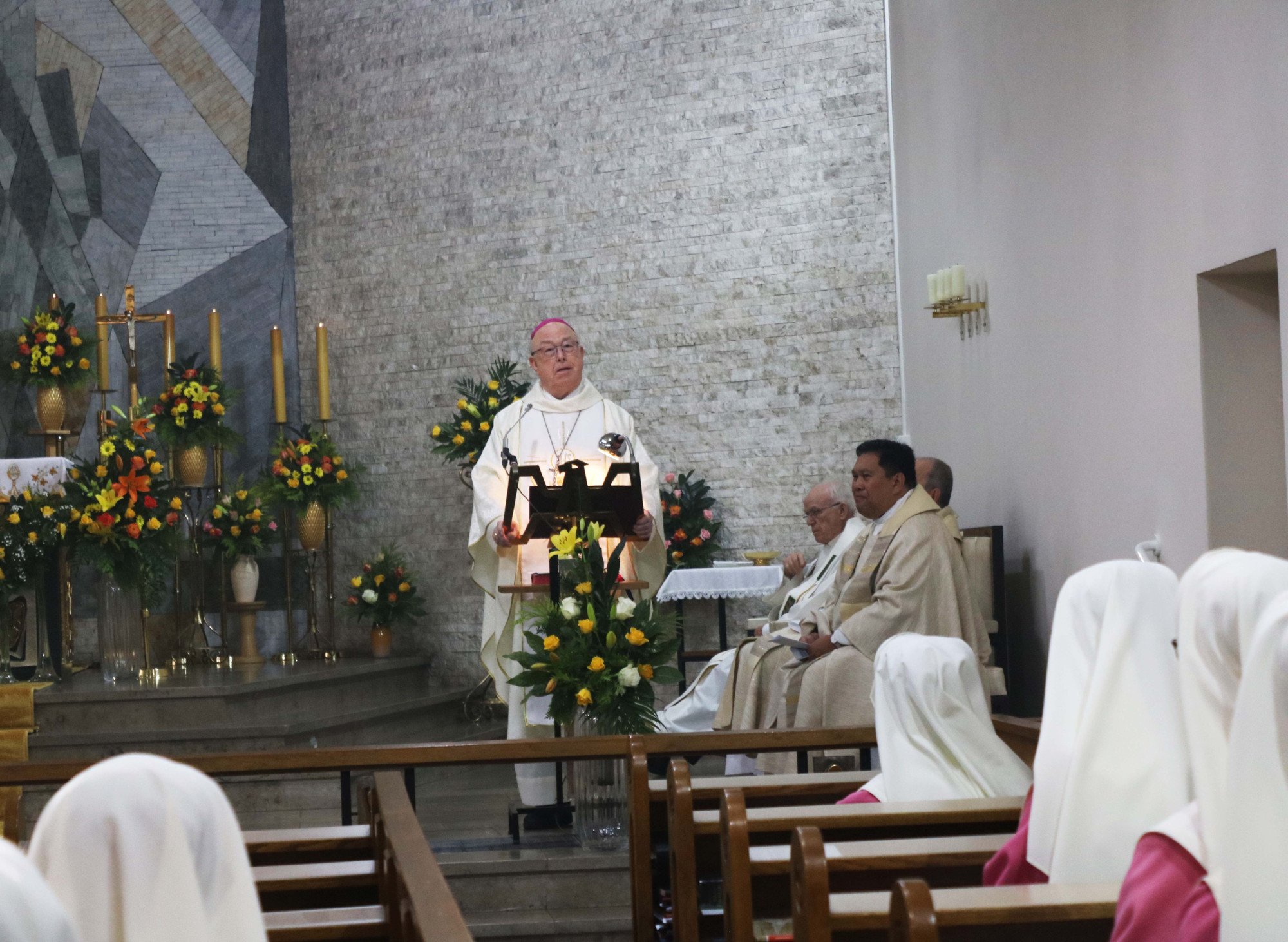 Ein großes Gemeinschaftsereignis war die Jubiläumsfeier mit anschließendem Empfang. Den Gottesdienst zelebrierte Erzbischof em. Hans-Josef Becker; die Predigt zitierte er dabei von seinem Nachfolger Erzbischof Dr. Udo Markus Bentz, den Erzbischof em. Becker kurzfristig bei der Jubiläumsfeier vertrat. Erzbischof Dr. Bentz würdigte das Wirken der Rosa Schwestern: „Wer glaubt, muss sich entscheiden: Der Mittelpunkt Ihrer Gemeinschaft und jeder einzelnen Schwester ist die Eucharistie. Hier preisen Sie im Dienst der ewigen Anbetung Gottes Heilstaten. Das ist die Mitte Ihres Glaubens und Ihres ganzen Lebens: Anbetung bei Tag und Nacht vor dem ausgesetzten Allerheiligsten. Und das ist dann auch Ihr öffentliches Zeugnis vor der Welt und damit zugleich Ihr Dank für das Geschenk der Gegenwart Gottes in dieser Welt, so wie sie eben ist. ‚Ihn kennt der Dank‘, sagt Friedrich Hölderlin, der hier in Bad Driburg die glücklichsten Jahre seines Lebens verbracht hat. Ihn, Christus, kennt nur der Dank. In diesem Danken und Andenken leben und glauben Sie Tag für Tag, Stunde um Stunde.“