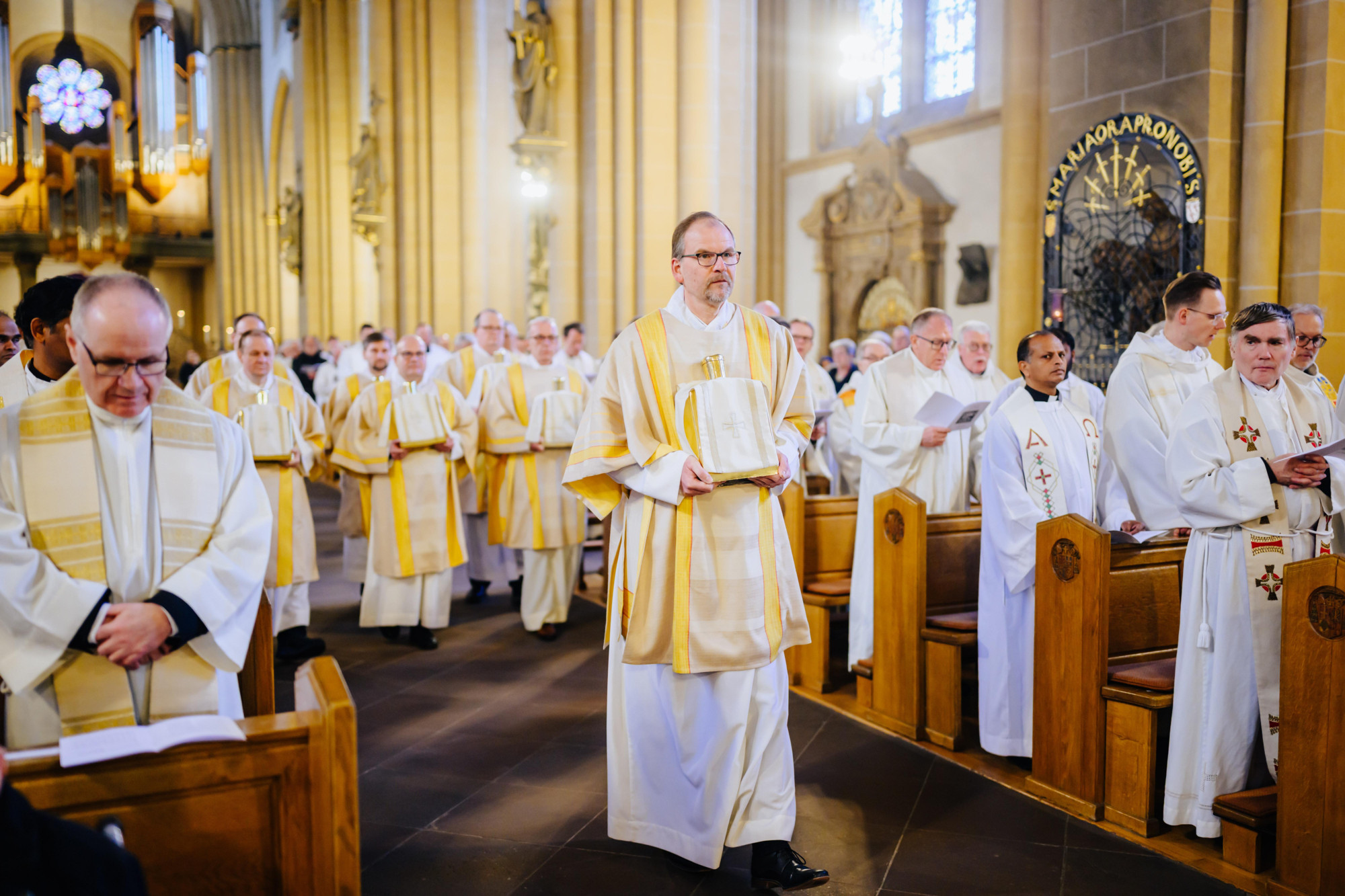 Nach der Predigt erneuerten die anwesenden Geistlichen gemeinsam ihr Weiheversprechen. „Ich bin bereit“ – mit diesen Worten antworteten sie mehrfach auf die Fragen nach ihrer Bereitschaft zum priesterlichen und diakonalen Dienst. In der Gemeinschaft der Mitbrüder und in der Bischofskirche des Erzbistums, wo sie in der Regel auch das Weihesakrament empfangen hatten, war dies keine bloße Absichtserklärung, sondern eine echte Stärkung im gemeinsamen Dienst – angesichts einer Fülle von Herausforderungen.