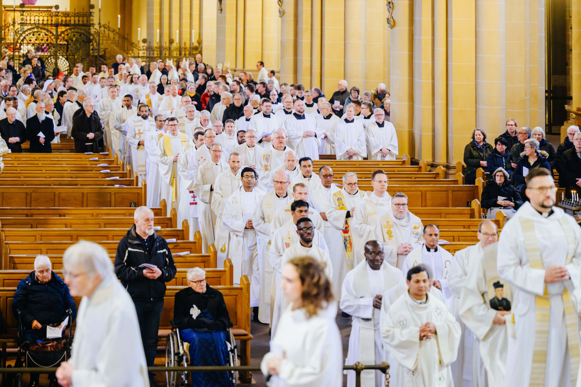 Im Gottesdienst konzelebrierten neben den Weihbischöfen Matthias König und Josef Holtkotte die Generalvikare Dr. Michael Bredeck und Thomas Dornseifer sowie die drei Mitglieder des geschäftsführenden Vorstands des Priesterrates im Erzbistum: Pfarrer DDr. Markus Jakobs, Pastor Sascha Heinrich und Pastor Thomas Bensmann. Die Diakone Viktor Schefer und Stefan Nagels assistierten. Musikalisch gestaltete die Mädchenkantorei unter der Leitung von Domkantor Patrick Cellnik und Emanuela Musso die Chrisammesse. Die Sängerinnen brachten Werke von Benjamin Britten und John Ireland zu Gehör. Domorganist Tobias Aehlig begleitete den Gottesdienst an der Domorgel.