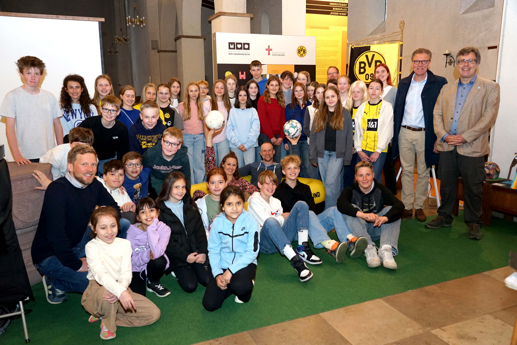 Seit Dienstag (11. Juni) sind die von den Schülerinnen und Schülern erstellen Kunstobjekte in der BVB-Gründerkirche, Flurstraße 10 in Dortmund zu sehen. Zur Ausstellungseröffnung versammelten sich die Teilnehmenden mit ihren Kunstlehrerinnen und –Lehrern sowie den beiden Schulleitern Christoph Weishaupt (Mallinckrodt-Gymnasium) und Philipp Fröhlich (Oesterholz-Grundschule) zum Gruppenfoto in der BVB-Gründerkirche.