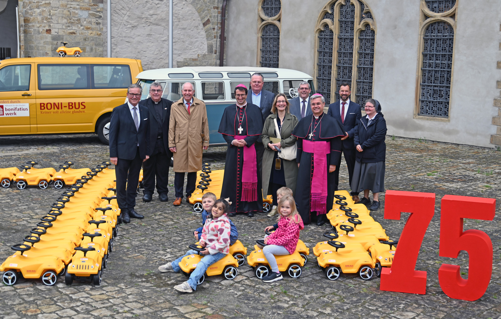 Neben dem 175. Geburtstag begeht das Bonifatiuswerk ein weiteres Jubiläum: Die Verkehrshilfe besteht in diesem Jahr seit 75 Jahren. „Diese 75 Jahre haben uns gezeigt, dass man nicht nur die Geradeaus- beziehungsweise die Überholspur nutzen sollte, sondern auch ruhig mal abbiegt, neue Wege einschlägt, damit sich neue Perspektiven eröffnen. Perspektiven für die Bedürfnisse der Menschen, die ihren Glauben auch im Wandel der Zeit erfahren. Der BONI-Bus ist eine willkommene Mitfahrgelegenheit, um Gemeinschaft und pastorales Leben in all seiner Vielfältigkeit zu stärken und konkret zu erleben“, sagte Generalsekretär Monsignore Georg Austen. Derzeit sind mehr als 600 BONI-Busse in den Fördergebieten unterwegs. Am Bonifatiustag wurden weitere 16 neue Fahrzeuge an Gemeinden und kirchliche Einrichtungen vergeben. Seit Beginn der Verkehrshilfe wurden etwa 3 500 Fahrzeuge finanziert.