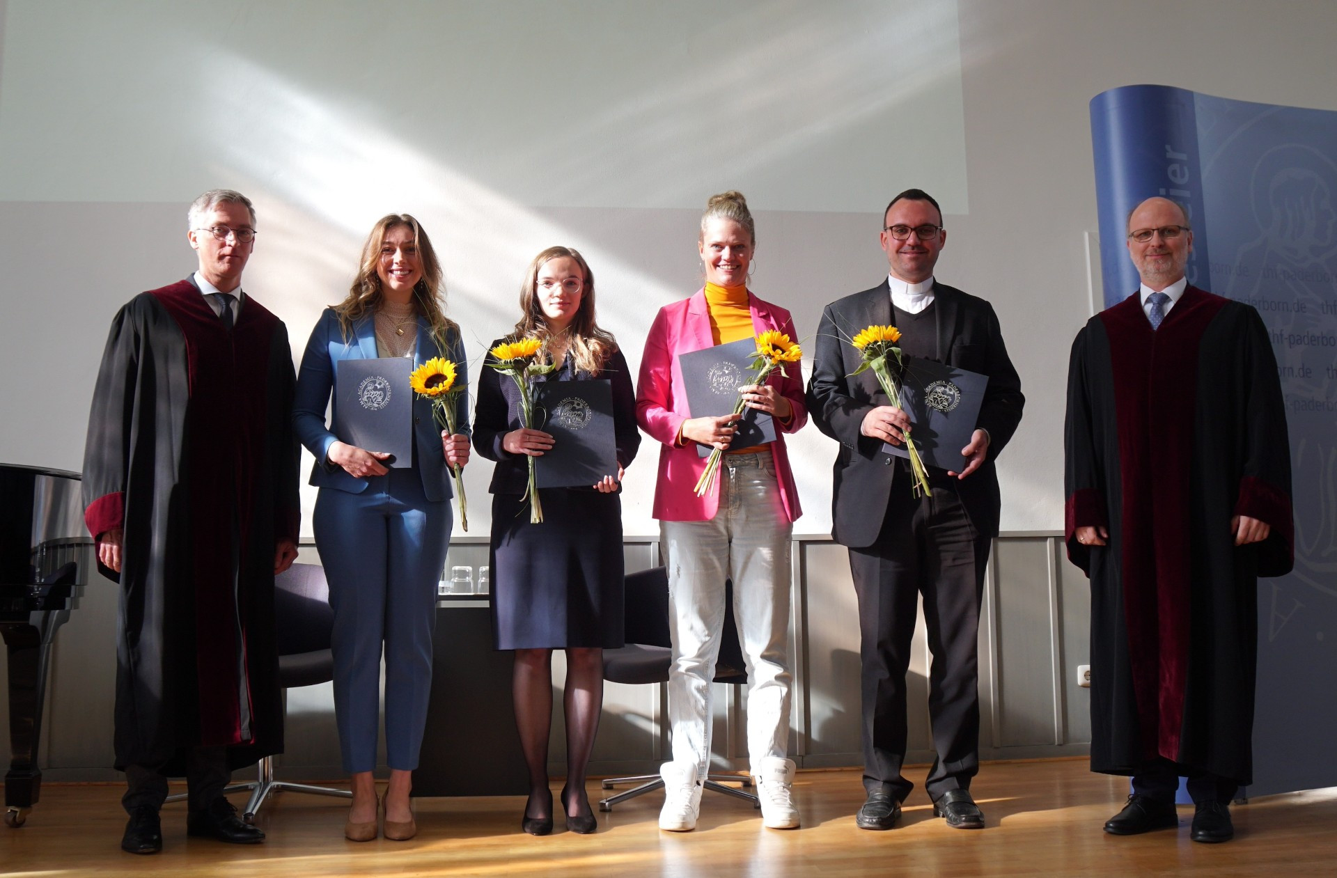 Im Rahmen der Akademischen Jahresfeier erhielten insgesamt sechs Absolventinnen und Absolventen ihre Abschlussurkunden. Laura E. Hennecke, AStA-Vorsitzende des Studienjahrs 2023/24, ging in ihrer Rede auf den Jahrestag des Hamas-Angriffs auf Israel ein und wünschte den neuen Studierenden, dass in Studium und Forschung statt trennender Mauern und schnell gefällter Urteile Raum für eine lehrreiche und reflektierte Meinungsbildung geschaffen werde und die Freude an der Theologie lebendig bleibe.