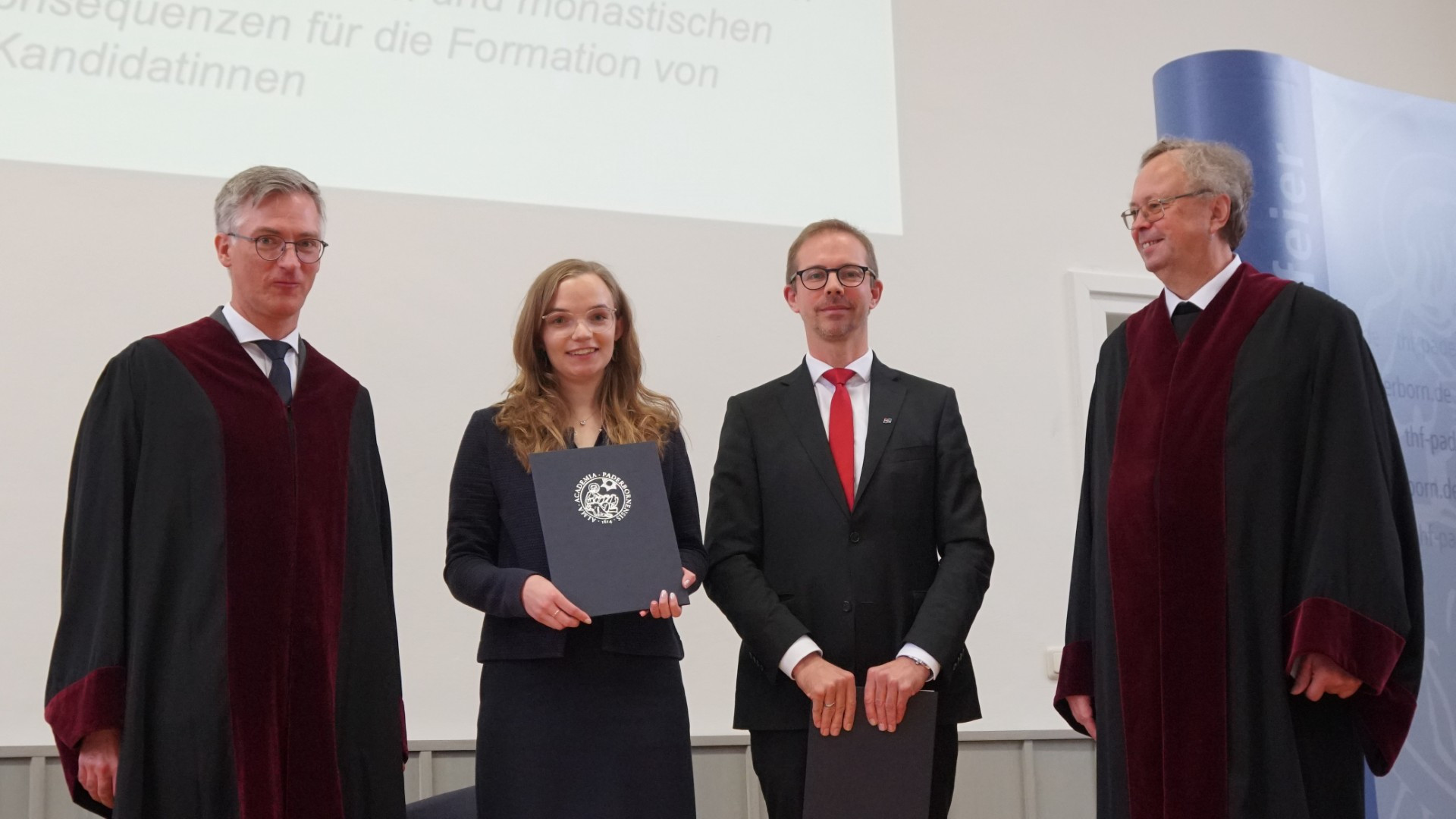Die Theologische Fakultät Paderborn verlieh den von der Bank für Kirche und Caritas Paderborn gestifteten Friedrich Spee-Preis für herausragende Abschlussarbeiten an Mag. theol. Theresa-Marie Oesselke für ihre Magisterarbeit „Wenn das geistliche Leben hinter Klostermauern zum Tatort wird. Eine kanonistische Studie zu Risiko- und Schutzfaktoren für geistlichen Missbrauch in kontemplativen und monastischen Frauenorden sowie Konsequenzen für die Formation von Kandidatinnen“, die sie im Studienjahr 2023/24 bei Prof. Dr. Rüdiger Althaus, Lehrstuhl für Kirchenrecht, angefertigt hat. Theresa-Marie Oesselke lege eine in theologisch systematischer wie inhaltlicher Hinsicht ausgezeichnete Forschungsarbeit vor, die von einem fundierten kanonistischen Fachwissen und einem scharfen analytischen Geist zeuge, so Laudator Rüdiger Althaus: „Mit erstaunlicher Sicherheit bewegt sie sich in einem dem wissenschaftlichen Diskurs gerade erst zugänglichen Bereich, die vorgelegte Studie erreicht dabei zweifelsohne das Niveau einer Doktorarbeit.“ Der Spee-Preis ist für Magisterarbeiten mit 2.500 €, für Dissertationen mit 5.000 € dotiert.