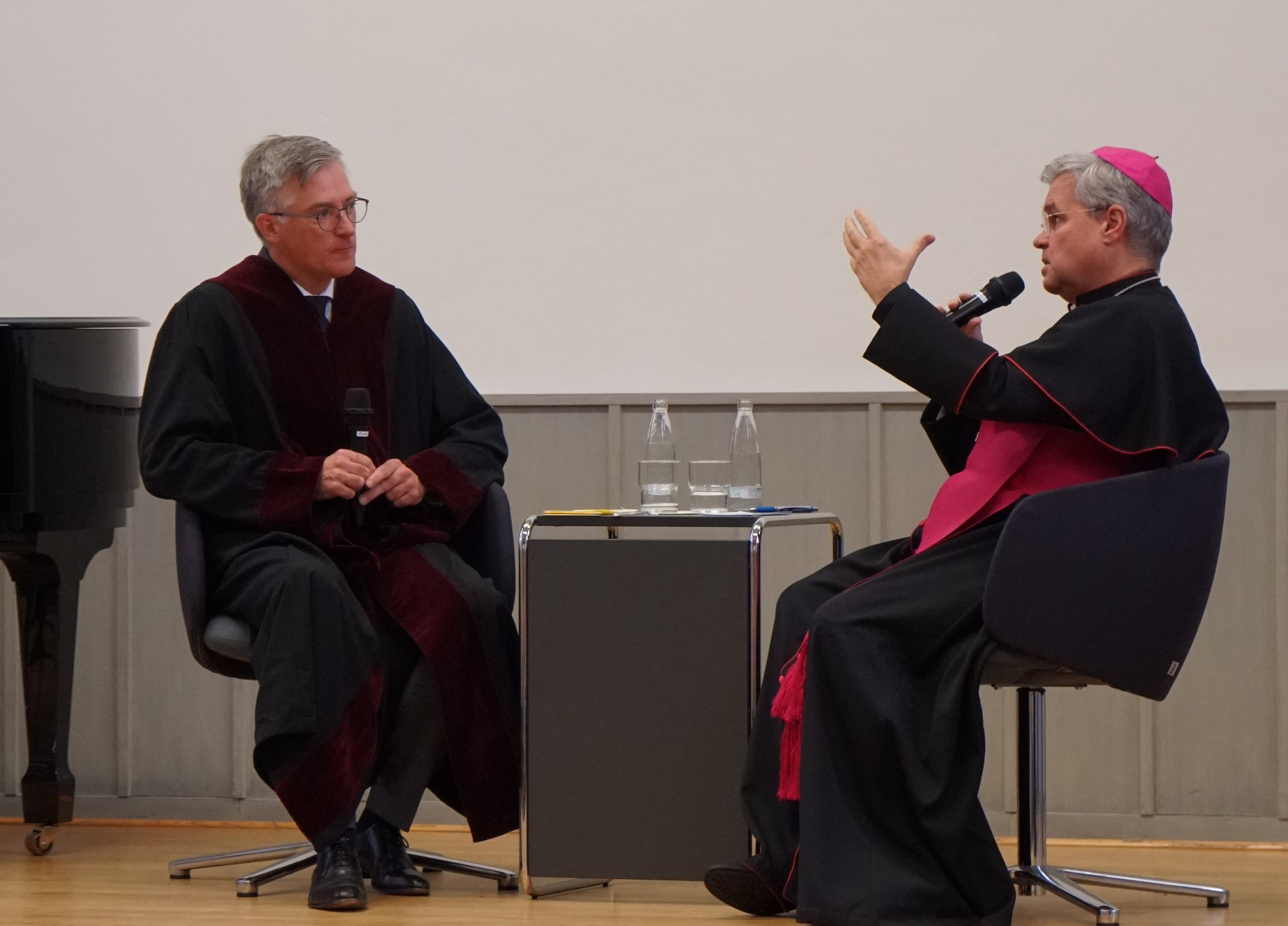 Im Dialog mit Prorektor Prof. Dr. Stephan Wahle sprach Magnus Cancellarius Erzbischof Dr. Udo Markus Bentz über die Theologie als Wissenschaft und stellte das Potenzial der akademischen Theologie am Standort Paderborn heraus. Für eine gute Priesterausbildung brauche es die Vernetzung und die Koedukation mit allen anderen kirchlichen Berufen, den Lehramtsstudierenden, den Pastoralreferentinnen und -referenten, den Gemeindereferentinnen und -referenten und das möglichst eng und verzahnt miteinander, so der Erzbischof. Aus eigener Erfahrung entstehe daraus keine Nivellierung, sondern eine Stärkung des Profils der kirchlichen Berufe. Zu fragen sei aber immer, was das Verbindende und was das Unterscheidende der beteiligten Akteure sei.