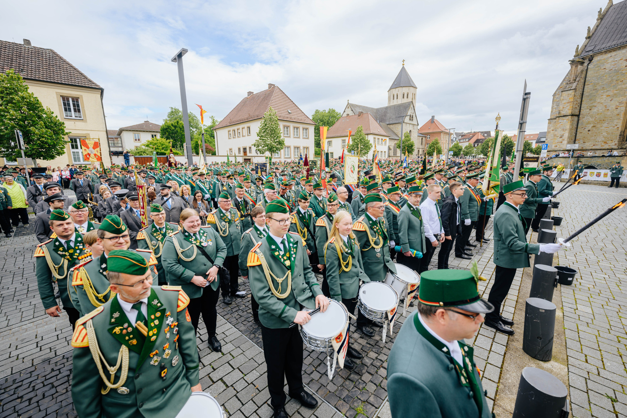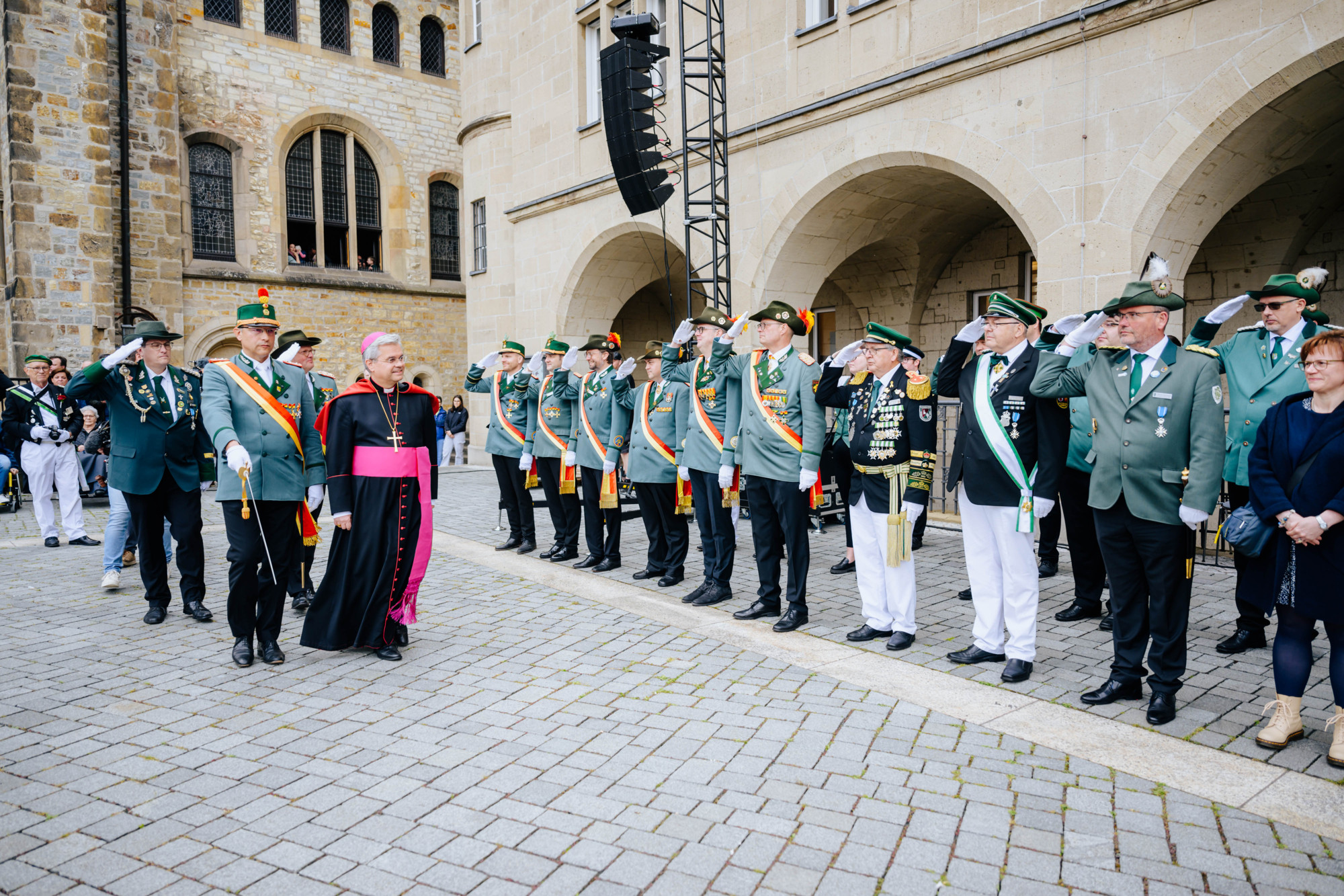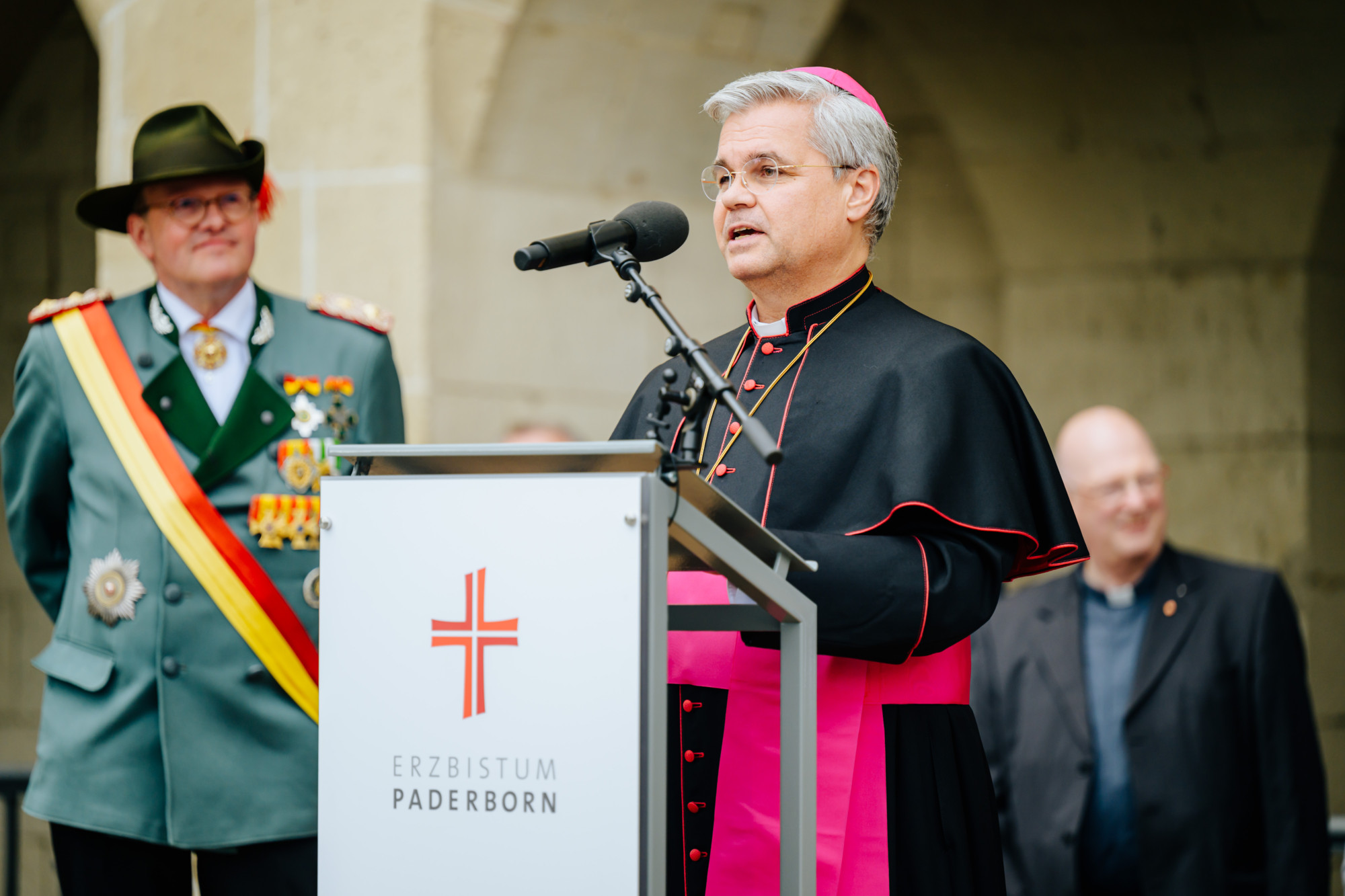 Der anschließende Abmarsch der Schützen und Musikkapellen vom Platz vor dem Generalvikariat, der eine Viertelstunde dauerte, weckte einen Vorgeschmack auf das Paderborner Schützenfest in knapp einem Monat. Erzbischof Dr. Udo Markus Bentz beteuerte: „Ich freue mich darauf!“