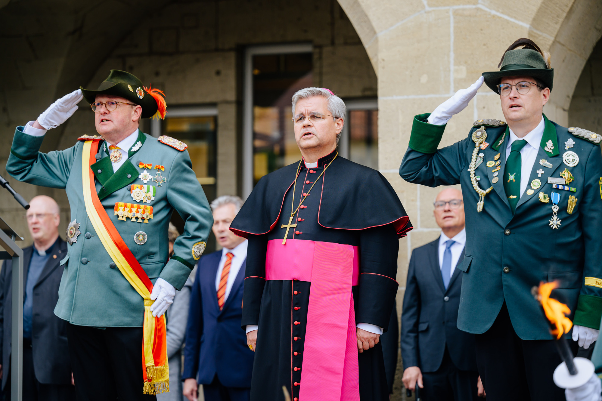 Bei einzelnen Mitbrüdern im Bischofsamt, die aus dem Erzbistum Paderborn stammen, erlebe er eine große Liebe zum Schützenwesen und damit eine große Verbundenheit mit der früheren Heimat. „Davon habe ich heue viel nachvollziehen können“, machte Erzbischof Dr. Bentz deutlich. Zudem hoffe er, dass der Zapfenstreich für alle Beteiligten und Zuschauenden deutlich gemacht habe, „wie verwurzelt auf christlichem Fundament wir in der Gegenwart stehen, aber den Himmel offen sehen. Wir wissen, was uns trägt“, fasste Erzbischof Dr. Udo Markus Bentz zum Abschluss seiner Dankesworte zusammen.