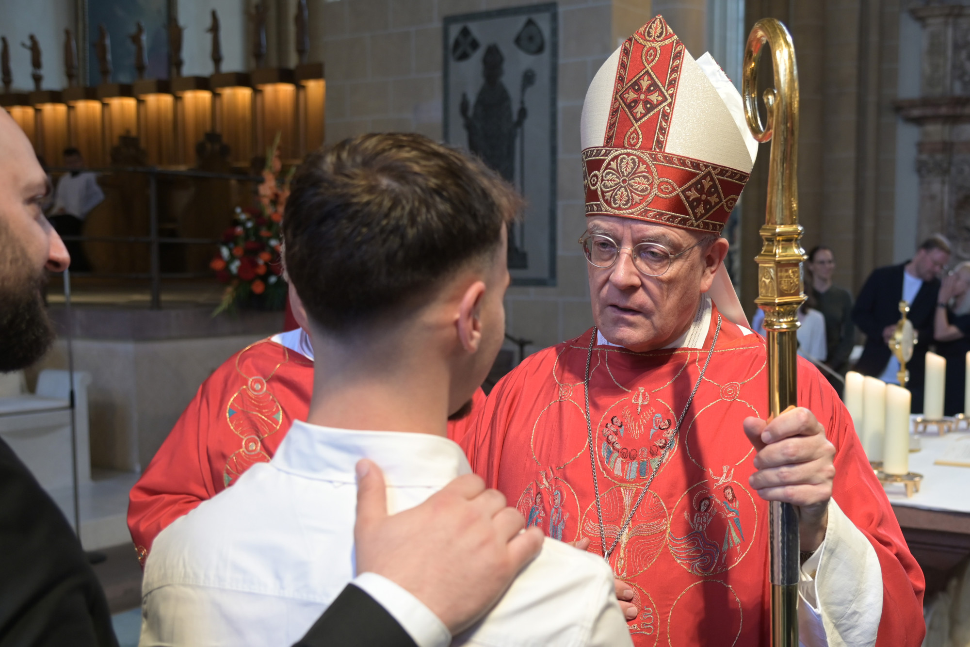 Mit der grundlegenden, schöpferischen Berufung zum Menschsein durch Gott sei die unaufhebbare und unverlierbare Würde jedes Menschen untrennbar verknüpft, erklärte Weihbischof König in der Predigt. Durch die Taufe werde die göttliche Berufung zum Christsein sichtbar, sie gliedere in die Kirche ein, die Firmung vollende diese Eingliederung, stärke zu einem Leben als Christ. Die Berufung zu einem Dienst in der Kirche – als Lektor, Messdiener, Lehrkraft, Caritas-Engagierte oder aber als Ordenschrist, Diakon oder Priester – gründe in den vorausgehenden Berufungen, erläuterte Weihbischof König. Es sei ein Ruf und eine Sendung, das Mensch- und Christsein zu gestalten, indem man einen Dienst in der Kirche ausübe. Weihbischof König erinnerte in diesem Kontext an den Empfang seiner Preisterweihe vor exakt 39 Jahren: Vor 39 Jahren sei auch er im Altarraum des Paderborner Domes gestanden und habe das Sakrament der Priesterweihe empfangen.