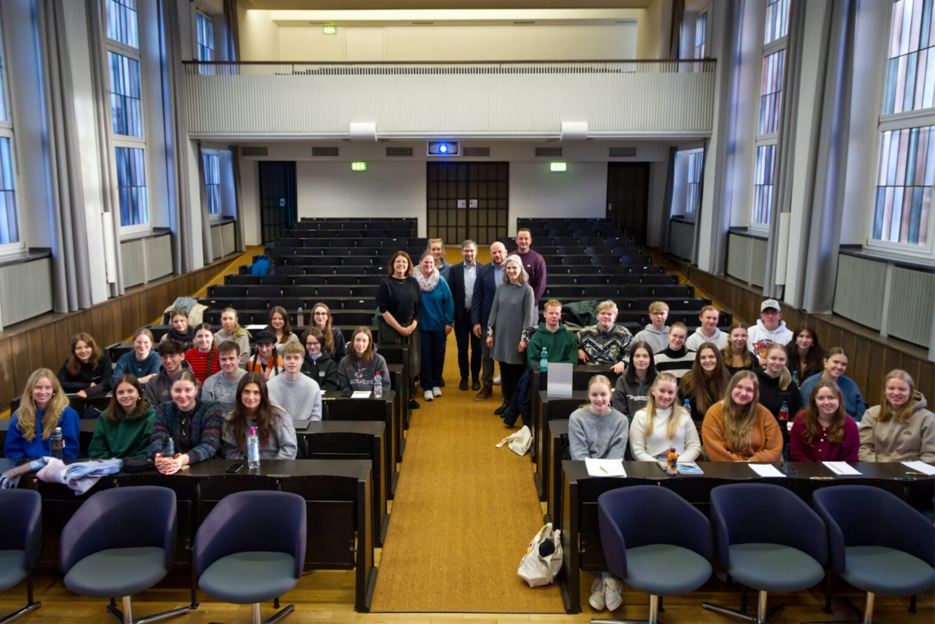 34 Abiturientinnen und Abiturienten des Franziskus Gymnasiums Lingen besuchten zusammen mit ihren Lehrerinnen Silvia Lühn, Elisa Eilermann und Katja Krumpholz sowie Andreas Bethke, dem Koordinator für die Berufsorientierung am Franziskus Gymnasium, die SchulUni.Theologie der ThF. Rektor Professor Dr. Aaron Langenfeld und Dipl.-Theol. Jessica Bohn, Referentin am Rektorat, begrüßten die Schülerinnen und Schüler im Audimax der Fakultät.