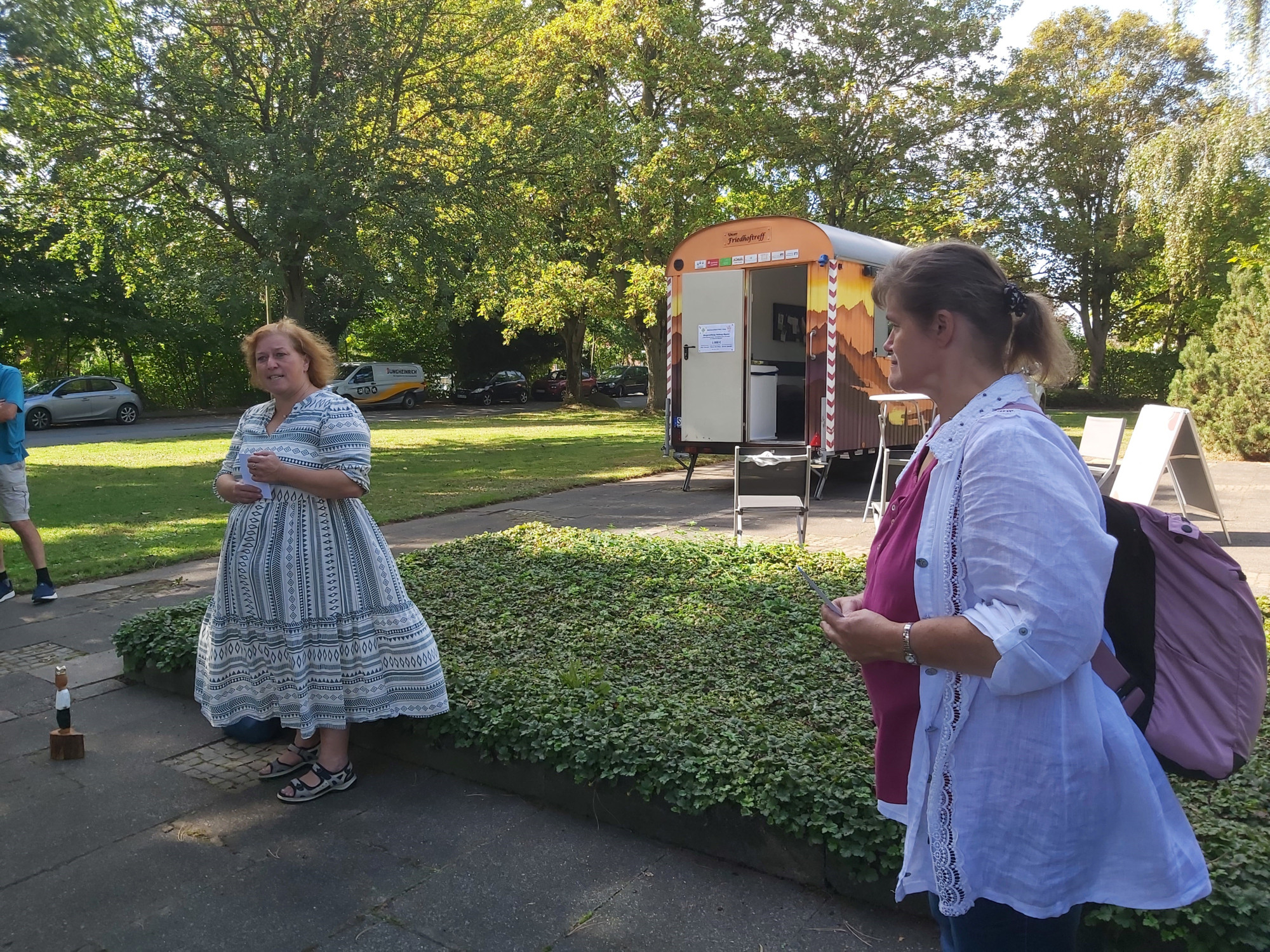 Dennoch schien es dem Vorbereitungsteam – dem AK Trauer des hiesigen Dekanates – wichtig, eine Reise an die Stätten anzubieten, wo Tod und Trauer ihren Raum haben. Michaela Labudda, Leiterin der Arbeitsgruppe und Dekanatsreferentin, begrüßte die Teilnehmer zunächst vor einem außergewöhnlichen Fahrzeug, das an diesem Datum seinen Parkplatz an der Pforte des Friedhofs Rhynern gefunden hatte. Bei dem Fahrzeug handelte es sich um einen Bauwagen, der zum mobilen Trauertreff umfunktioniert worden war. Dieser Wagen macht Halt dort, wo Menschen zusammenkommen, die sich austauschen wollen, dort thematische Anregungen an die Hand bekommen.