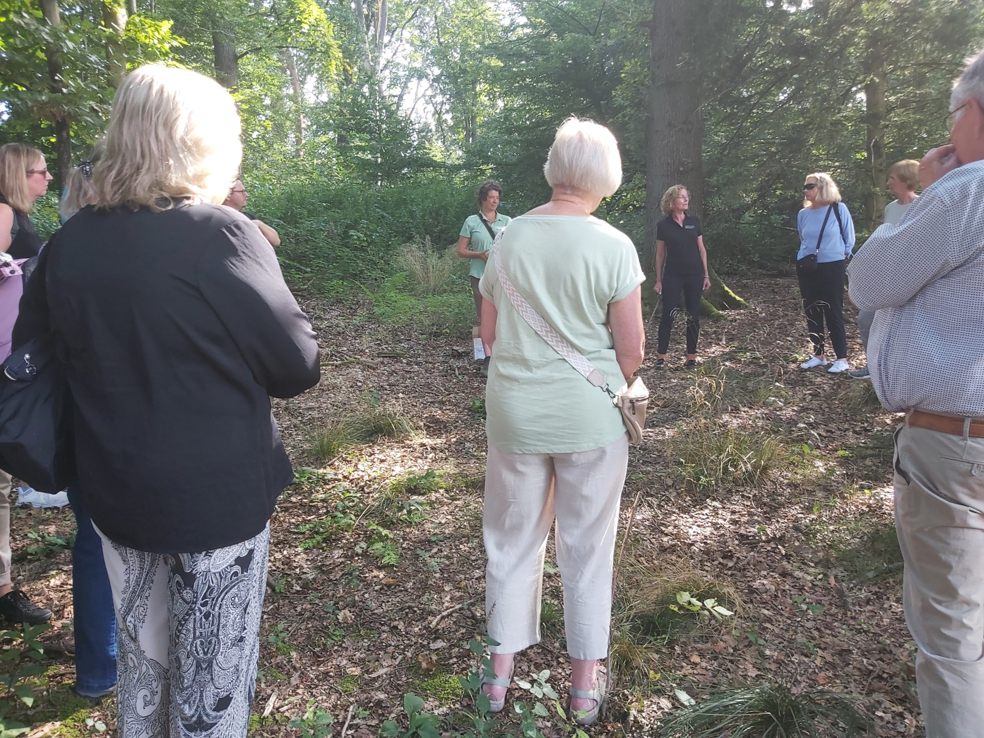 Nach der Besichtigung führte der Weg die interessierte Zuhörerschaft auf den Friedhof, der besonders geschmückt ist durch einen mit vielfältigen Akzenten ausgeschmückten Meditationsweg. Künstlerische Stelen geben Johannesworte wieder, die zum Verweilen, Beten, Trost finden einladen. Dem Gang über die Ruhestätte, die sich in dieser Form seit der Sanierung von 2013/14 präsentiert, schloss sich die eigentliche Busfahrt an, deren erstes Ziel der Friedwald Möhnesee war. Hier wurde die Gruppe von Martina Wenner, Bestatterin aus Bad Sassendorf, empfangen, die sachkundig führte und den Friedwald als Beisetzungsort anschaulich vorstellte.