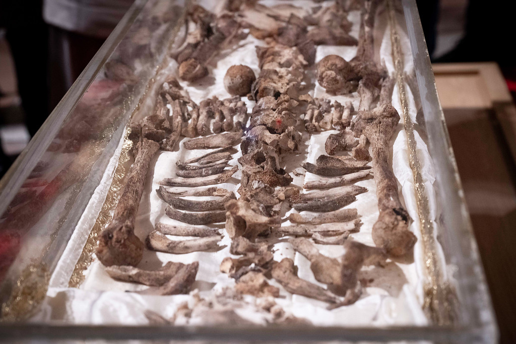 Vorne angekommen, fällt der Blick auf viele dunkle Knochen und Bruchstücke, die in dem gläsernen Schrein zu einem menschlichen Skelett zusammengefügt sind. „Nicht stehenbleiben, keinesfalls sprechen oder fotografieren“, heißt es auch hier. Viele berühren die kühle Oberfläche des Sargs, doch für ganz große Emotionen scheint der Moment zu kurz.