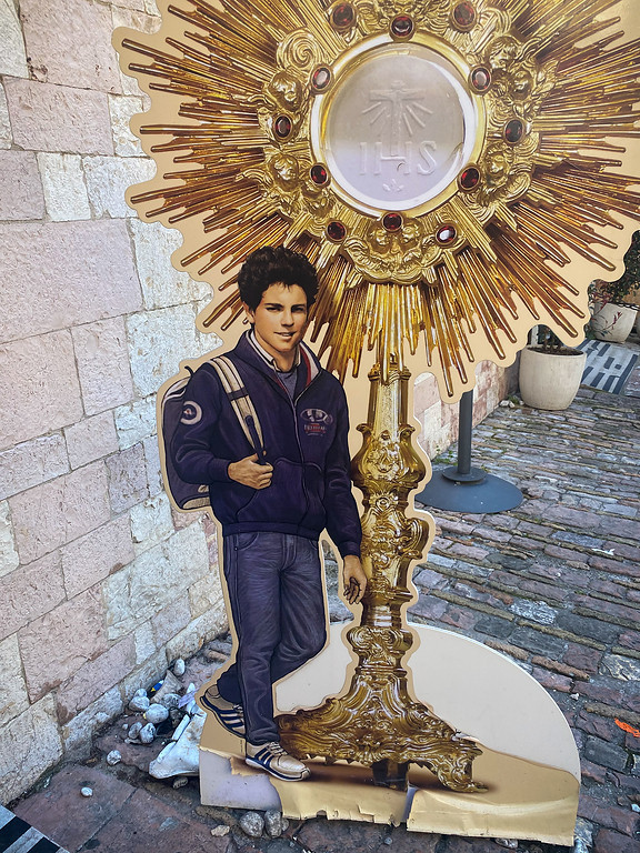 Langsam wogt der Pilgerstrom durch die schlichte weiße Kirche. Schilder mit der Aufschrift „Tomba di San Carlo Acutis“ weisen den Weg zum Grab des jungen „Internet-Apostels“. Nicht stehen bleiben, nicht fotografieren, mahnen Helfer in verschiedenen Sprachen. Dann, im rechten Seitenschiff von Santa Maria Maggiore in Assisi, der gläserne Sarg des Carlo Acutis (1991-2006): ein Teenager in Jeans, Nike-Sneakers und Trainingsjacke, der zu schlafen scheint.