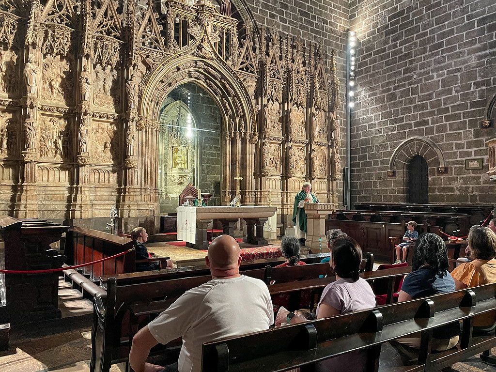 Nach dem Bürgerkrieg wurde der „Santo Cáliz“ 1939 zunächst in der Seidenbörse aus dem 15. Jahrhundert aufbewahrt. Doch seit dem Wiederaufbau der Kathedrale leuchtet er dort wieder in seinen bräunlichen Farben, so Domherr Álvaro Almenar leise in der Kapelle, in der die Pilgergruppe mittlerweile mit ihrem Gottesdienst begonnen hat.