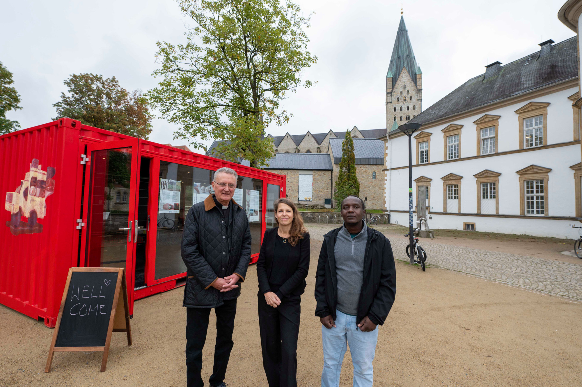 Der rote Übersee-Container vor der Paderborner Stadtbibliothek ist für Kulturpädagogik-Professorin Dr. Maren Ziese ein „mobiles Art Education Lab“ und ermöglicht, Objekte aus der Missionssammlung Neuenbeken erstmals ins Stadtzentrum zu bringen und einer breiten Öffentlichkeit zugänglich zu machen. Aktuell wird das Kunstvermittlungslaboratorium im Übersee-Container von Peterson Kmwathi, einem Künstler aus Nairobi, genutzt, der zum Themenfeld „Missions- und Kolonialgeschichte, Identität und Mobilität“ arbeitet: Inspiriert von Händen von Figuren im Paderborner Dom schafft er künstlerische Verbindungen zwischen seiner Heimat Afrika, genauer Kenia, und Europa. Das Projekt ist Teil der Initiative „Räume öffnen. Ein internationales Kunstvermittlungsprojekt einer Missionssammlung im Erzbistum Paderborn“, die der Erzbischöfliche Stuhl zu Paderborn mit seiner Stiftung Bischof Meinwerk in Höhe von 670.000 Euro und damit 87 Prozent der Gesamtkosten fördert.