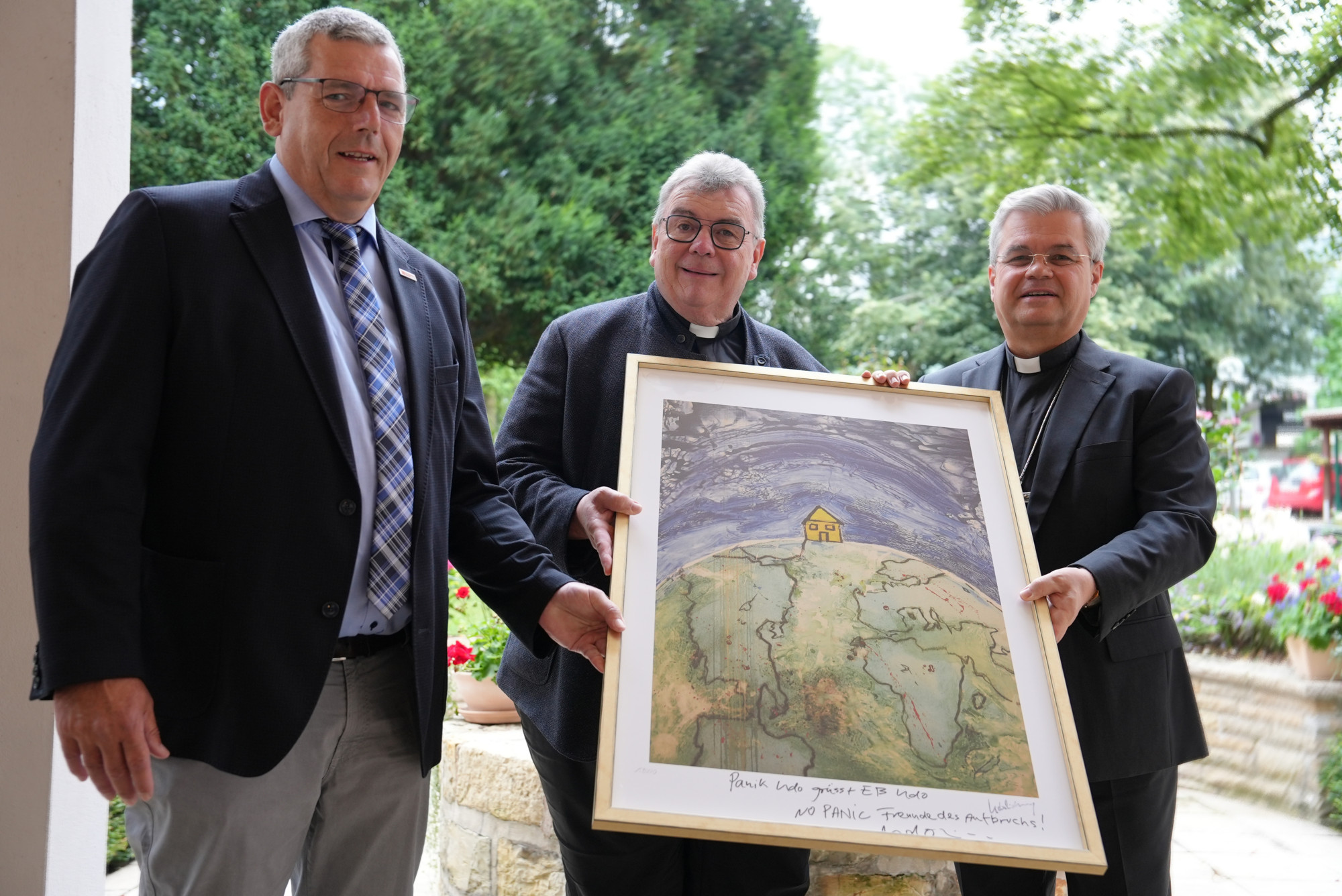 „NO PANIC, Freunde des Aufbruchs!“ und „Panik Udo grüsst EB Udo“ hat der Musiker und Künstler Udo Lindenberg als persönliche Nachricht auf das Bild geschrieben, das am Freitag von Bonifatiuswerk-Generalsekretär Monsignore Georg Austen und Bonifatiuswerk-Geschäftsführer Ingo Imenkämper als Geschenk an den Paderborner Erzbischof Dr. Udo Markus Bentz überreicht wurde.