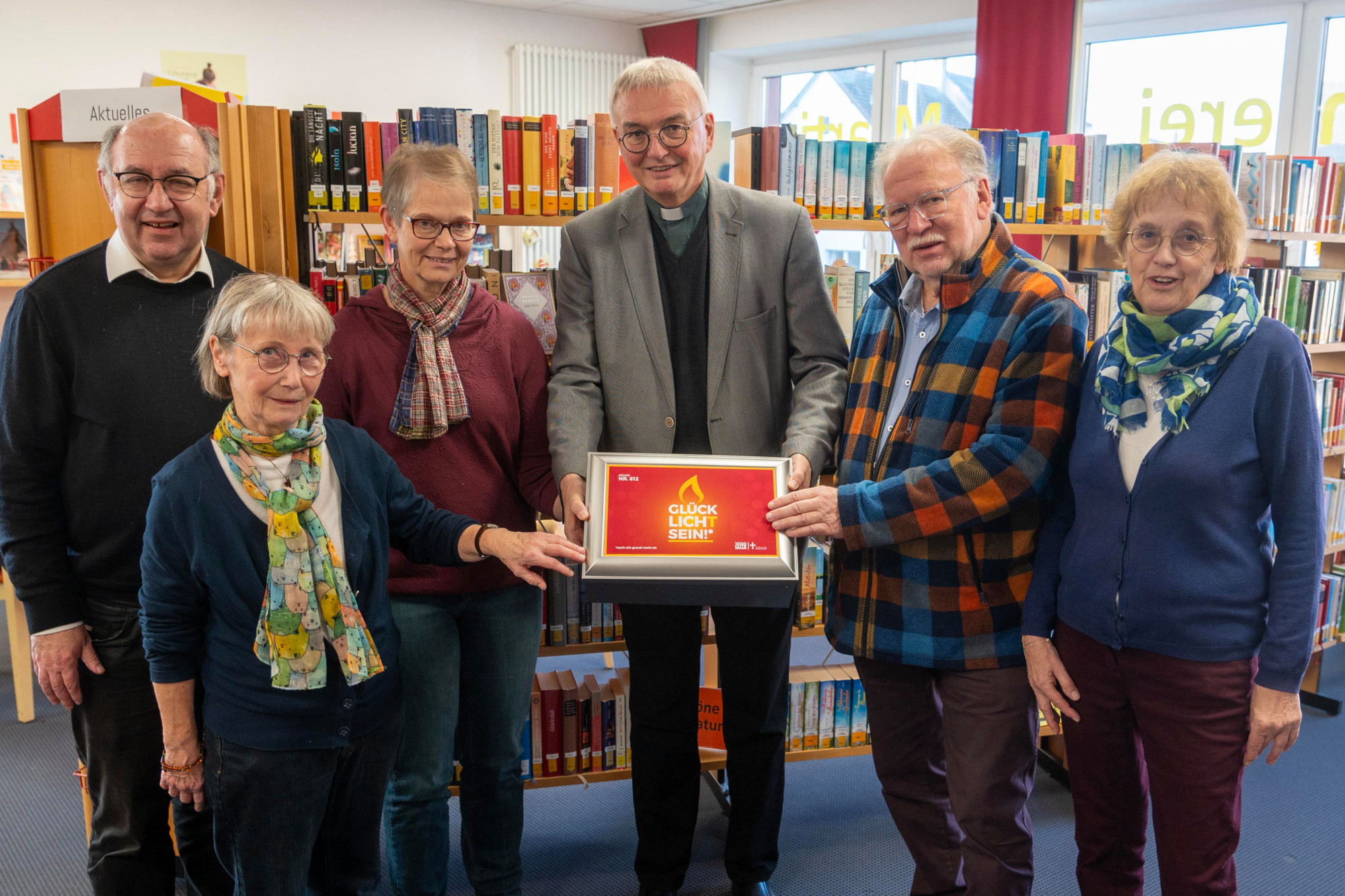 Generalvikar Thomas Dornseifer nutzte die Gelegenheit, sich herzlich bei den Mitarbeiterinnen und Mitarbeitern der Katholischen Öffentlichen Bücherei St. Martin in Bad Lippspringe zu bedanken, ihnen Dank zu sagen für die Organisation und Beteiligung am Bundesweiten Vorlesetag, aber insbesondere für deren großes Engagement in der Bücherei „zum Wohl von Kindern, Jugendlichen, Erwachsenen“. Mit einer mit Süßigkeiten gefüllten GLÜCKLICH/T-Box würdigte Generalvikar Dornseifer die ehrenamtliche Arbeit, nannte die Mitarbeitenden – stellvertretend für alle 1.800 Büchereimitarbeitenden im Erzbistum Paderborn – GLÜCKLICH/Ter, die „über das ganze Jahr Lese-Freude bei ihren Mitmenschen“ ermöglichen. „Vielen Dank für ihr Wirken und Licht-Sein für die Menschen hier.“