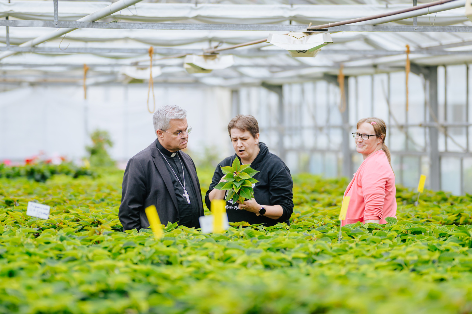 In den Caritas-Werkstätten Arnsberg ist die erste Besuchsstation von Erzbischof Dr. Udo Markus Bentz die Gärtnerei. Der Paderborner Erzbischof schaut den Beschäftigten nicht nur über die Schulter. Er spricht jede und jeden persönlich an, interessiert sich, hört zu. Was ist hier die Aufgabe? Wie lange dauert so ein Gesteck? Seit wann wachsen die Weihnachtssterne hier schon? Woran erkennt man jetzt schon, ob das ein roter oder weißer Weihnachtsstern ist?