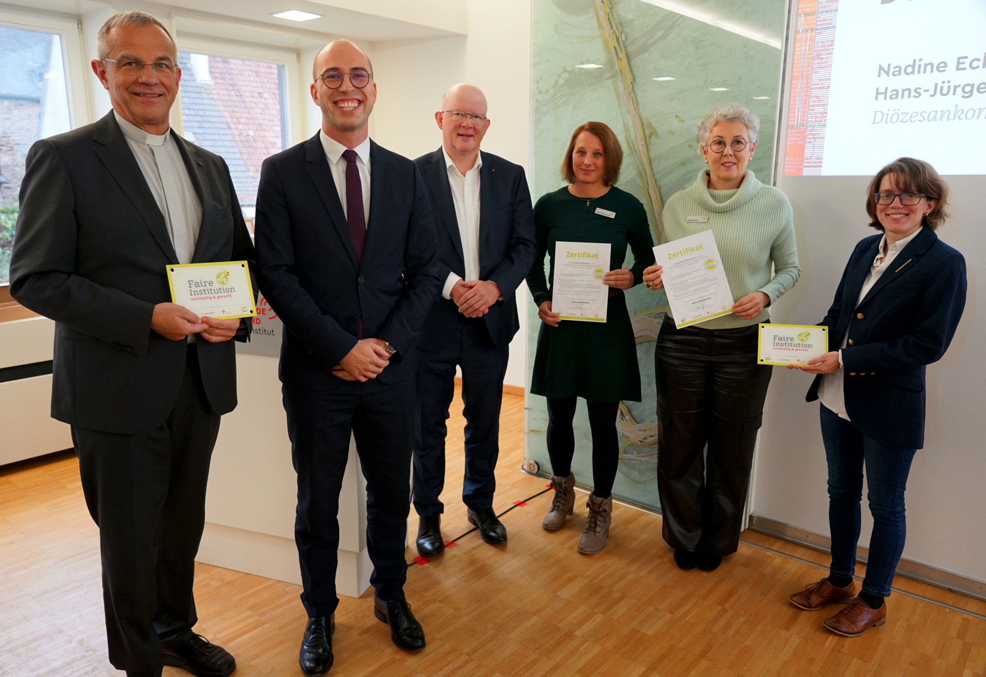Selbst einen Preis erhielt die Kommende Dortmund dann für ihre nachhaltige Energienutzung und die Verwendung fair gehandelter Produkte. Nadine Eckmann und Dr. Hans-Jürgen Schlinkert vom Diözesankomitee und Maximilian Schultes vom Erzbistum Paderborn überreichten die Auszeichnung als „Faire Institution“.
