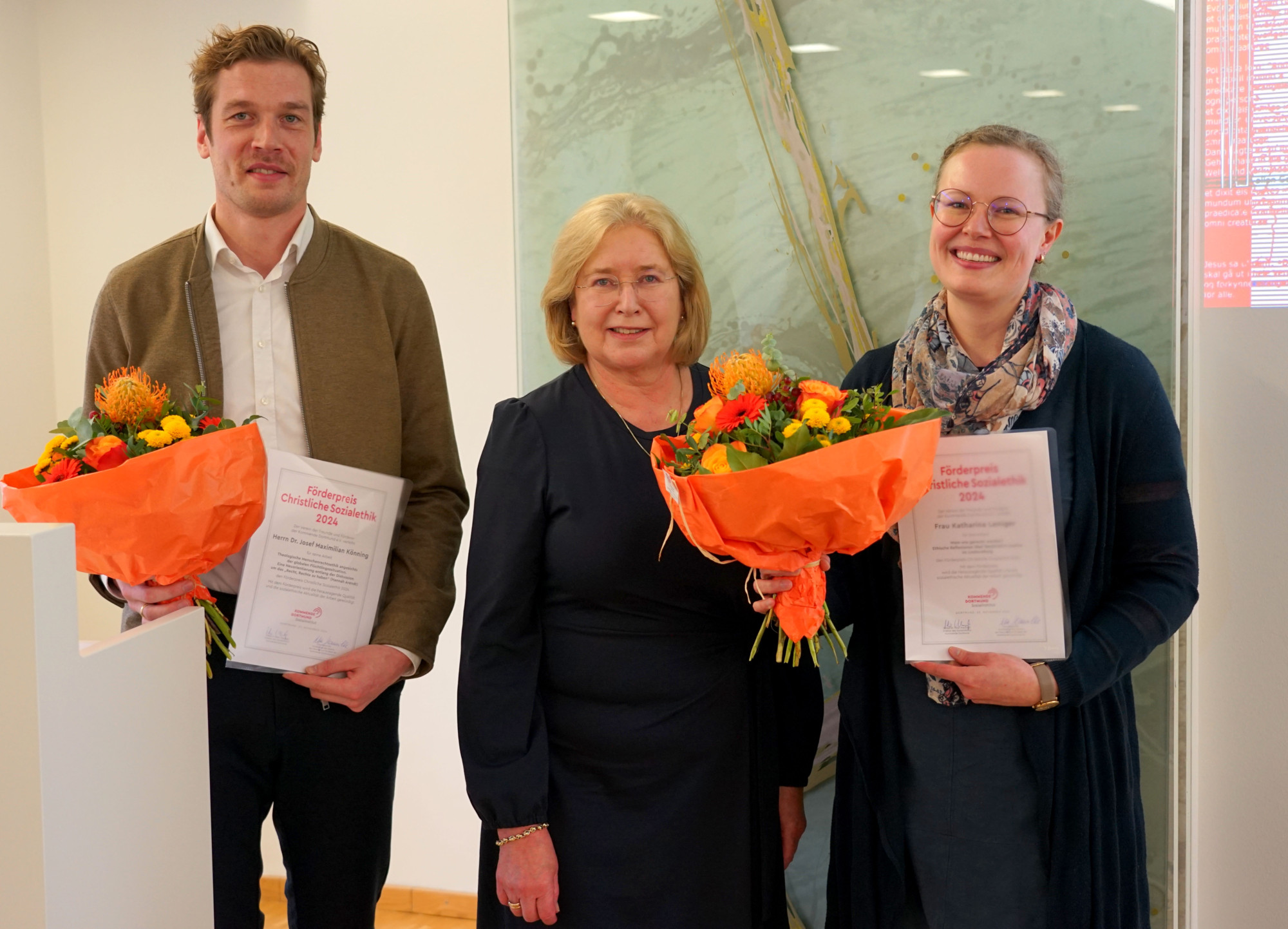 Im Anschluss an das Podiumsgespräch wurde der mit insgesamt 3.000 Euro dotierte Förderpreis Christliche Sozialethik 2024 vom Verein der Freunde und Förderer der Kommende e.V. an die Preisträger Dr. Josef M. Könning und Katharina Leniger überreicht. Ute Hanswille, Vorsitzende des Vereins der Freunde und Förderer der Kommende e.V., stellte deren wissenschaftliche Arbeiten vor.