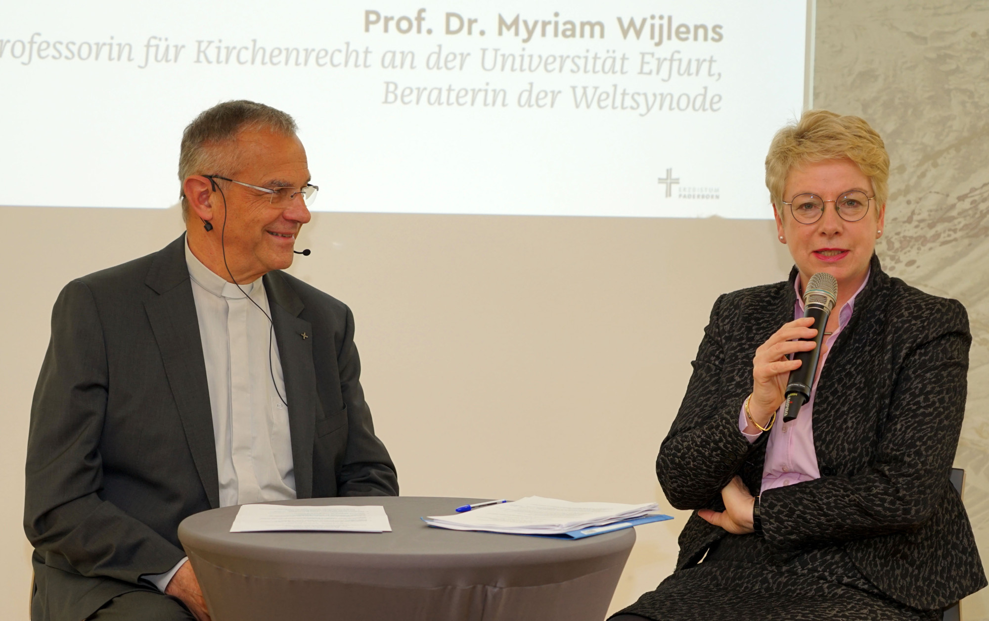 Die niederländische katholische Theologin Prof. Dr. Myriam Wijlens, die an der Universität Erfurt Kirchenrecht lehrt, war oft die einzige katholische Frau in Gremien und Kommissionen der Weltkirche. Als Mitglied der Steuerungskommission der Synode und als Konsultatorin der Bischofssynode hat sie den Finger am Puls der Synode und gestaltet deren Dynamik wesentlich mit. Davon berichtete sie am Samstag im Gespräch mit Prälat Dr. Peter Klasvogt. Anhand von Bildern des Ersten und des Zweiten Vatikanischen Konzils und der Weltsynode von 2021 bis 2024 veranschaulichte Professorin Wijlens einen Kulturwandel in der Weltkirche.