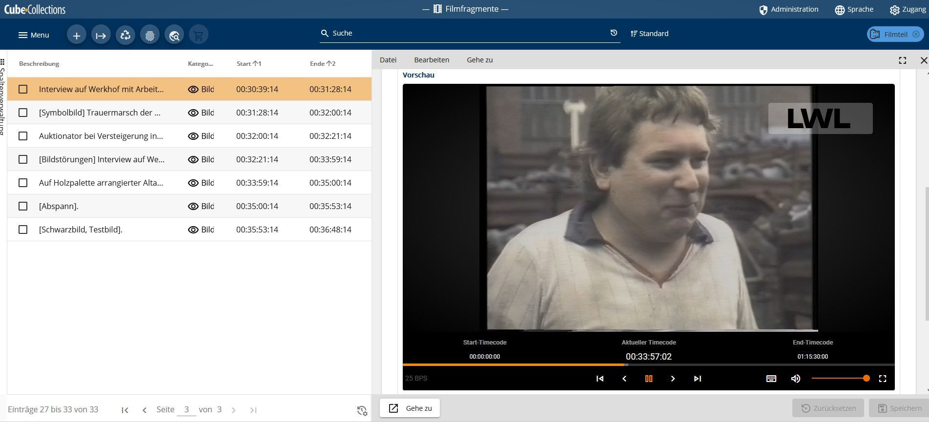 Aber nicht nur darüber freuen sich die Mitarbeiter im Archiv. Die Qualitätskontrolle, das Auslesen der Metadaten und die Relevanzbeurteilung der Digitalisate, die Recherche, Sichtung und Bestellung von audiovisuellen Medien, das Verzeichnen und die Lagerverwaltung der analogen und digitalen Datenträger sowie die Rechteverwaltung – all das kann in dem neuen System erledigt werden. Dabei bleiben alle Datensätze untereinander verknüpft, Zusammenhänge sind jederzeit mit wenigen Klicks erkennbar. „Besonders froh sind wir über die Möglichkeit, Film- und Tonaufnahmen inhaltlich zu erschließen. Durch den integrierten Player können wir einzelne Filmsequenzen durch das Setzen von Anfangs- und Endmarkierungen bildgenau zu beschreiben“, erläutert Fey die Funktionalitäten. Das neue System haben die LWL-Fachleute vor über 400 Archivarinnen und Archivare beim Deutschen Archivtag in Suhl vorgestellt und stieß dort auf große positive Resonanz.