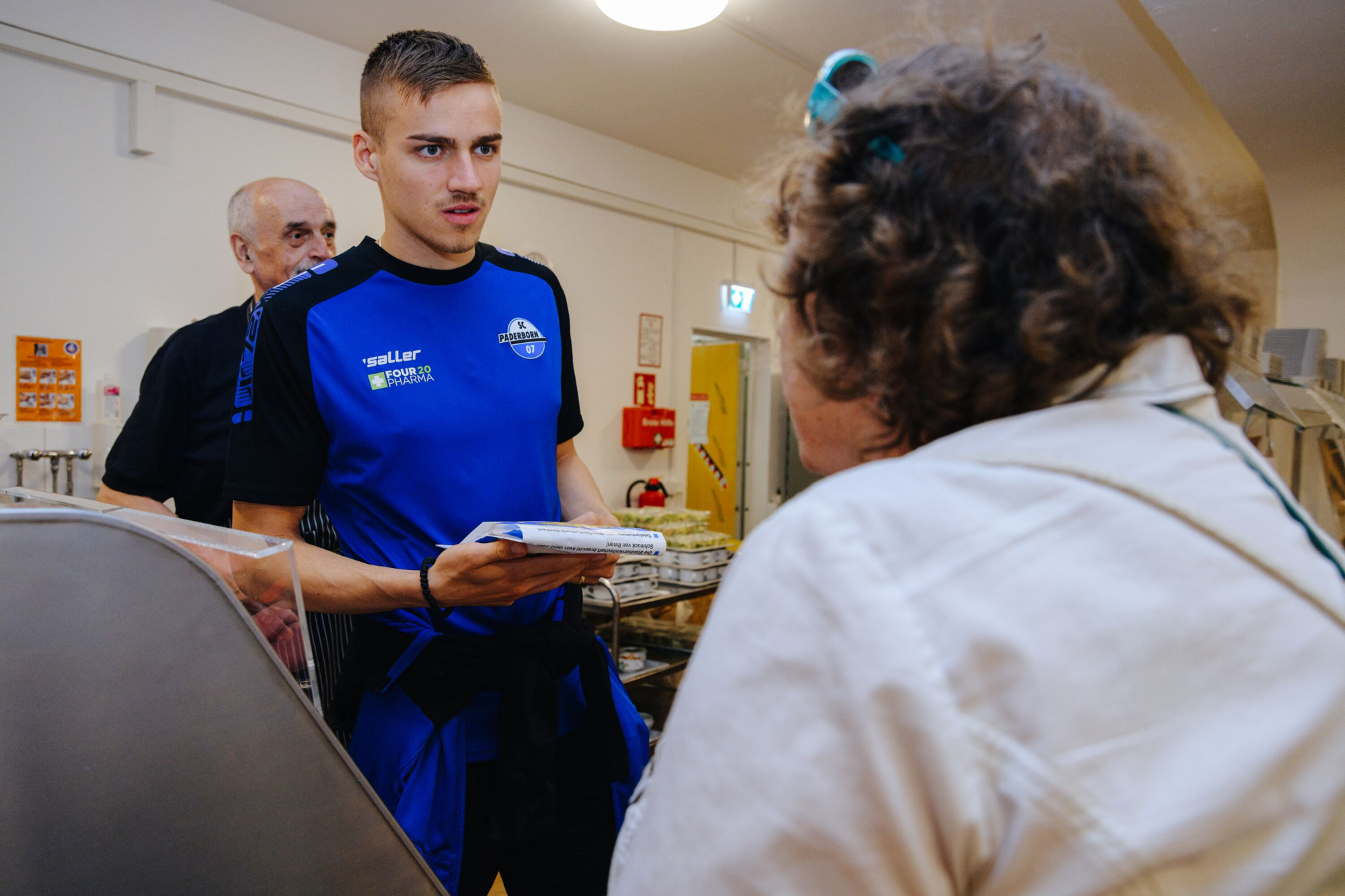 Kein alltäglicher Mittag im Paderborner Gasthaus PaderMahlZeit: Mit Filip Bilbija und Pelle Boevink unterstützten zwei Profifußballer des SC Paderborn 07 die Ehrenamtlichen bei der Essensausgabe für bedürftige Menschen. Und das nicht ohne Grund: Der Fußball-Zweitligist hatte das Mittagessen gespendet und dafür gesorgt, dass Schnitzel, Kartoffelgratin, Plunderteilchen und noch mehr an die zahlreichen bedürftigen Menschen ausgegeben werden konnte