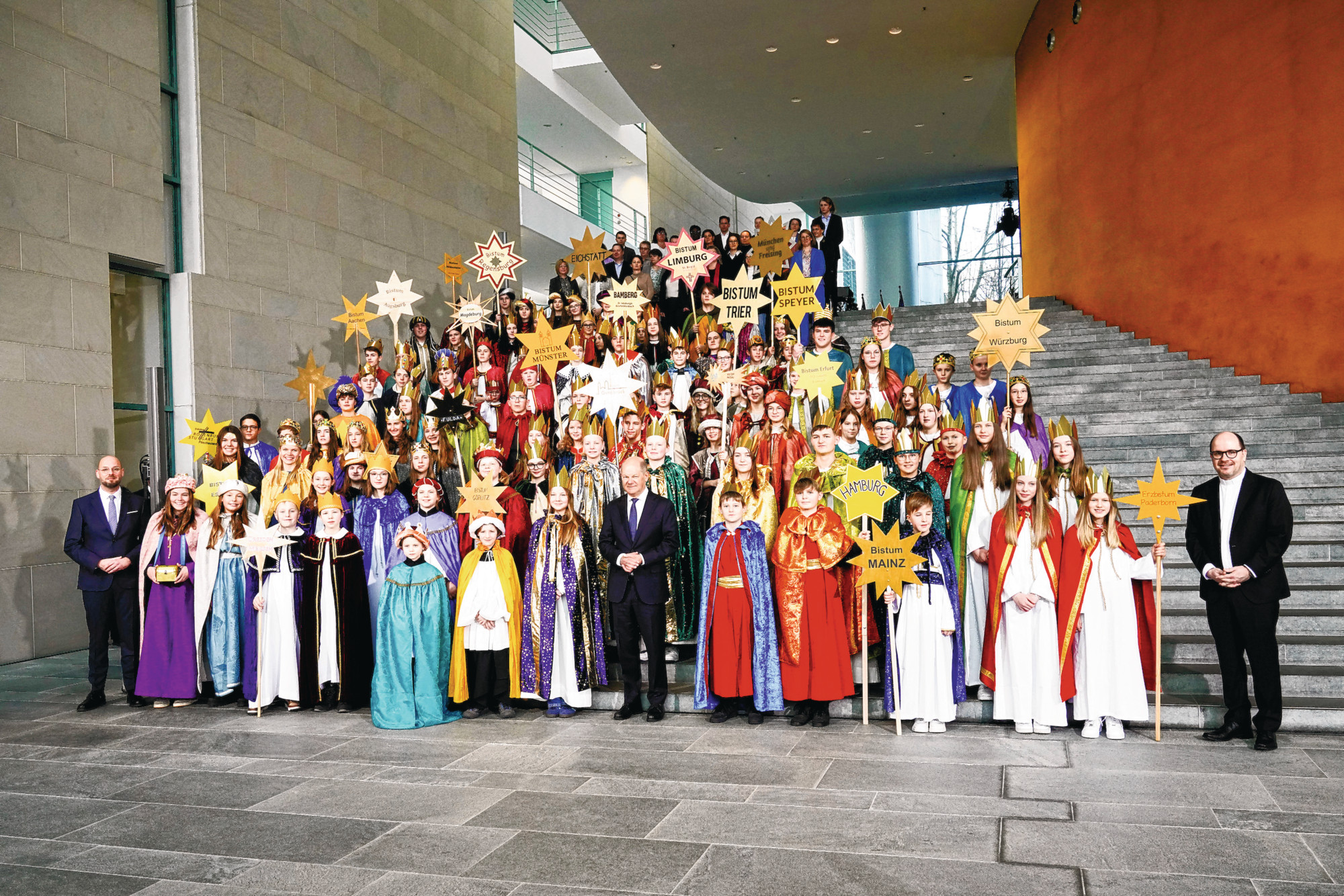 Kronen, Sterne und Kinder in prächtigen Gewändern: Bundeskanzler Olaf Scholz empfing am 7. Januar 108 Sternsinger aus ganz Deutschland. Seit 1984 bringen die Sternsinger jedes Jahr ihren Segen „Christus mansionem benedicat – Christus segne dieses Haus“ ins Bundeskanzleramt. Eine verantwortungsvolle Aufgabe gab es für Luisa (15), Carlotta (14), Lina (15) und Lotta (12) aus der Gemeinde Kirche St. Johann Baptist – Probstei St. Marien Schwelm (Bistum Essen). Sie nahmen die Spende von Bundeskanzler Olaf Scholz entgegen. Auch Verterterinnen und Vertreter aus dem Erzbistum Paderborn waren in der Bundeshauptstadt vor Ort. Die Sternsingerinnen Maleen (13), Paula (13), Josefin (13) und Anna (10) reisten aus dem pastoralen Raum Rietberg an und stellten dem Bundeskanzler das Motto der 67. Aktion Dreikönigssingen, „Erhebt eure Stimme! – Sternsingen für Kinderrechte“, vor.